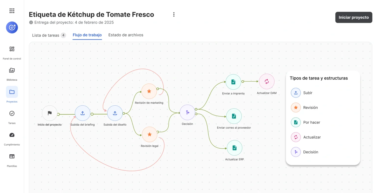Construye flujos de trabajo tanto secuenciales como paralelos para gestionar todo el proceso de packaging, desde la entrega del diseño hasta la aprobación final.