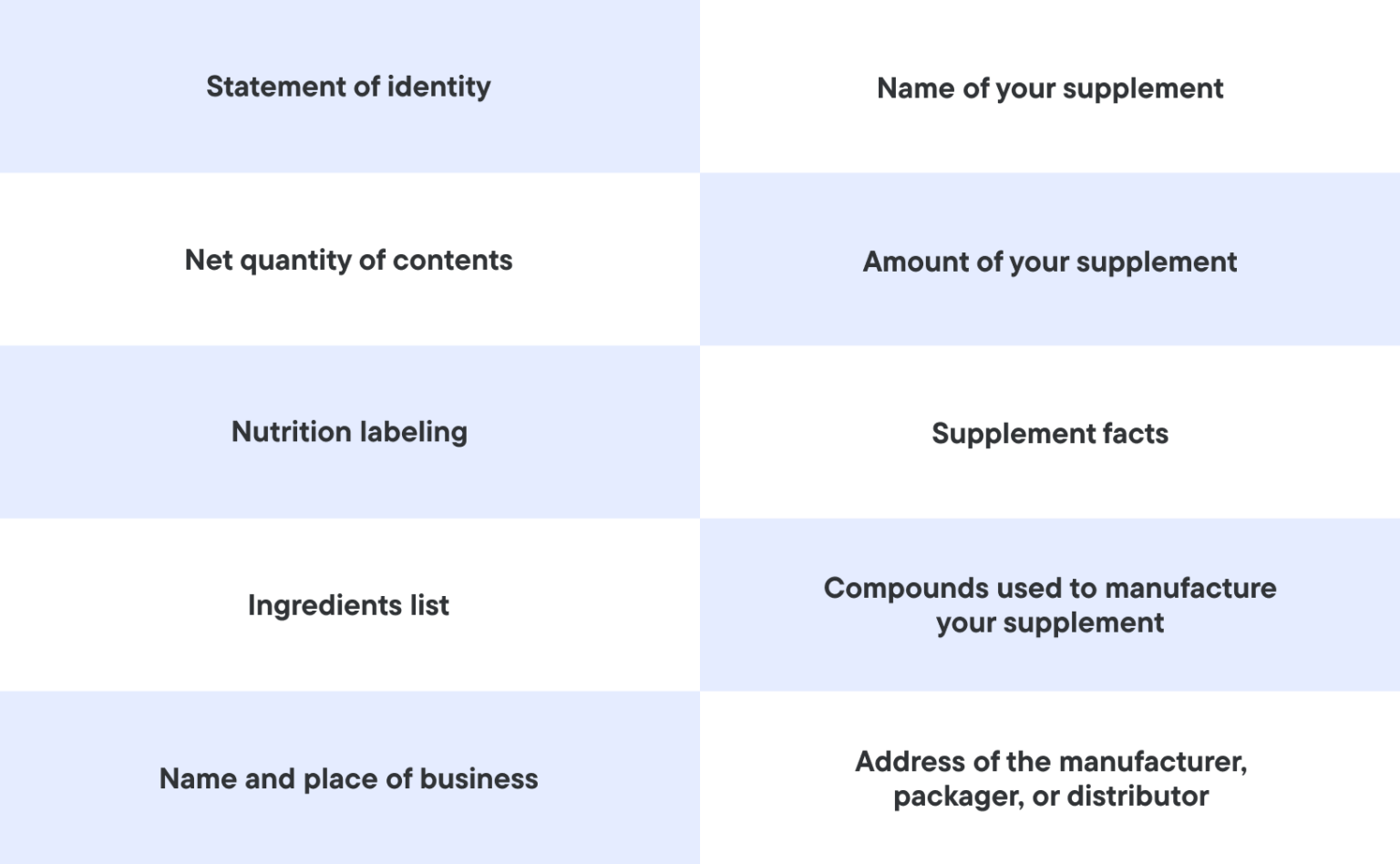 - Name of the supplement: The label must clearly state the product’s name, ensuring it speaks to the product’s contents and function.
