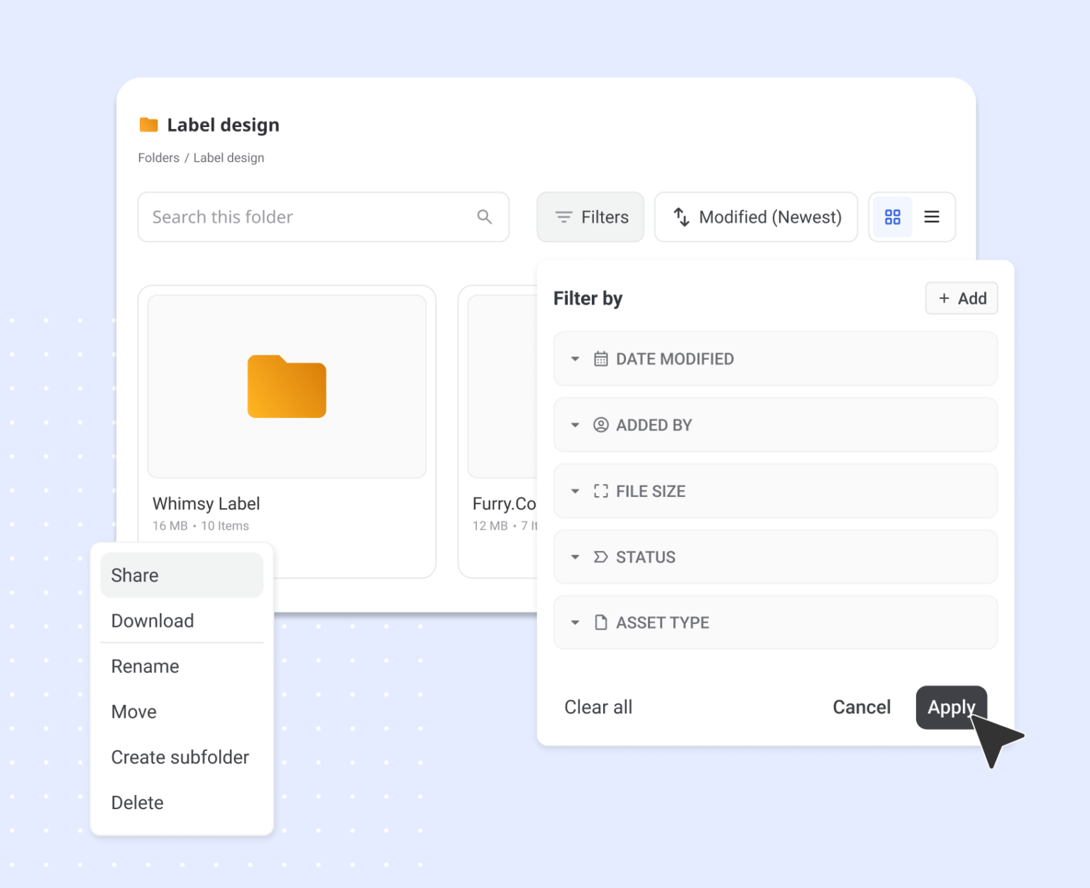 - External access: Share approved assets safely with vendors or partners via secure links without the cost of messy email chains.