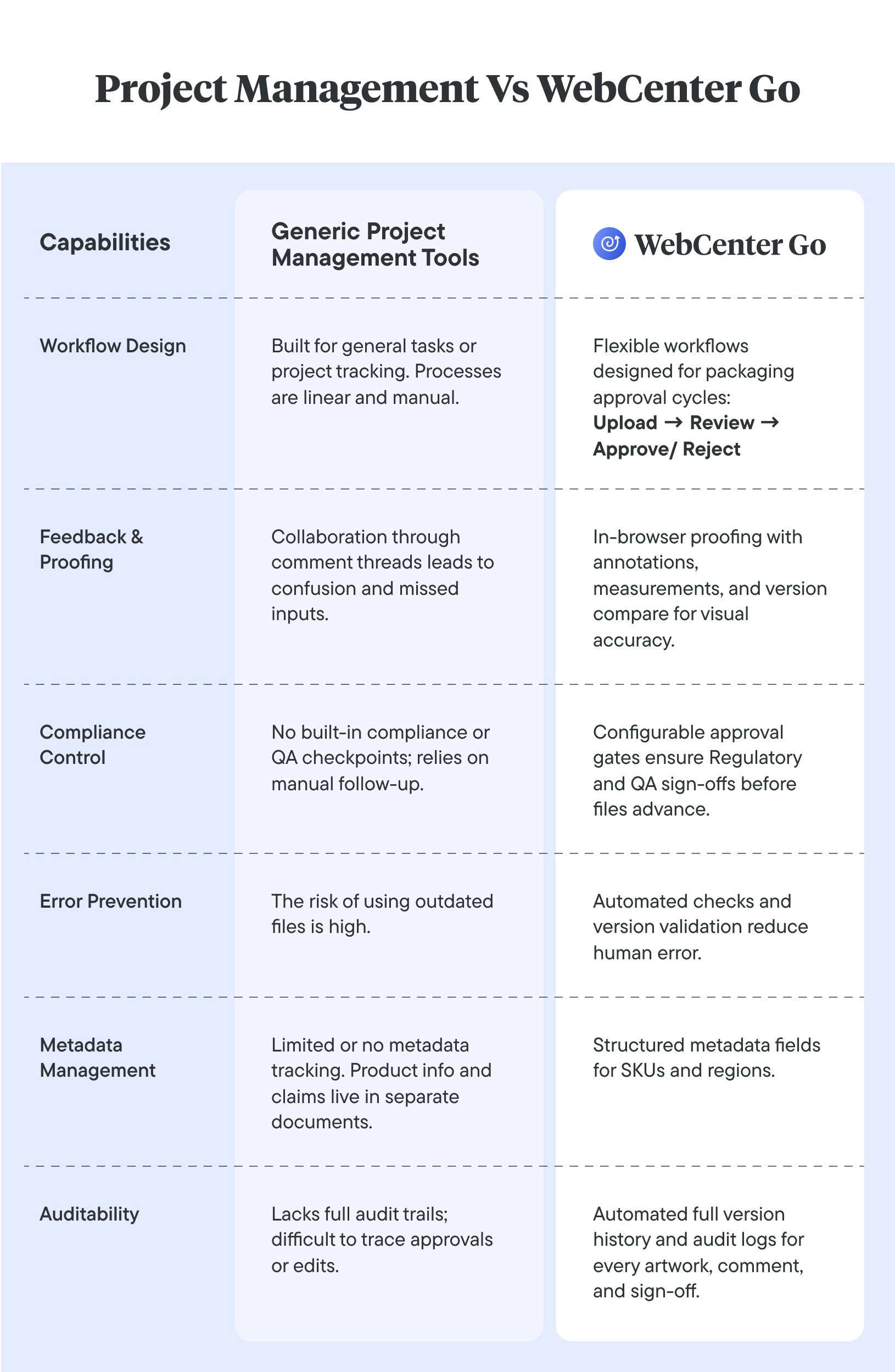 Your Quality team doesn’t have to keep pointers or rules in your head anymore. Leading artwork management tools like WebCenter Go add the guardrails generic project management tools don’t have.