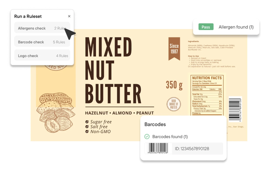 - Identify critical errors: Spot labeling mistakes such as missing allergens, inaccurate numbers, and typos that can cost you reprints.