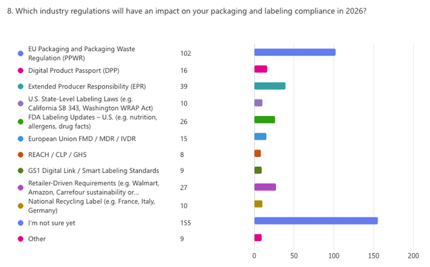 The loudest message from the survey isn’t about any single regulation — it’s uncertainty. Of 429 respondents, over 150 admitted they don’t know what will shape compliance in 2026, with PPWR and EPR emerging as the most cited among those who did take a position.