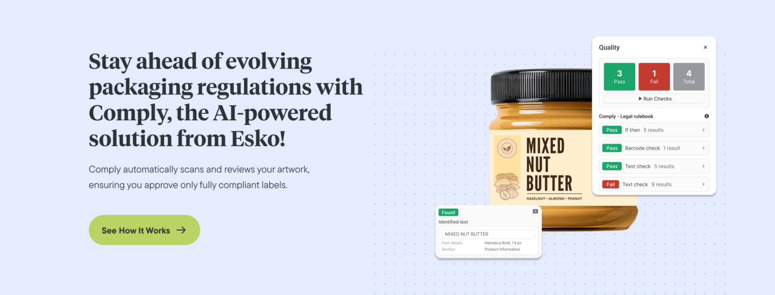 You can run Comply directly during the review stage by integrating it into your packaging workflow. Comply scans each artwork against your rulebooks and instantly flags any deviations. It checks spelling, formatting, critical statements, logo accuracy, barcode standards, nutrition table structure, and other regulated elements. This ensures reviewers get an automated list of errors before the file is approved, reducing back-and-forth and preventing non-compliant designs from slipping through.