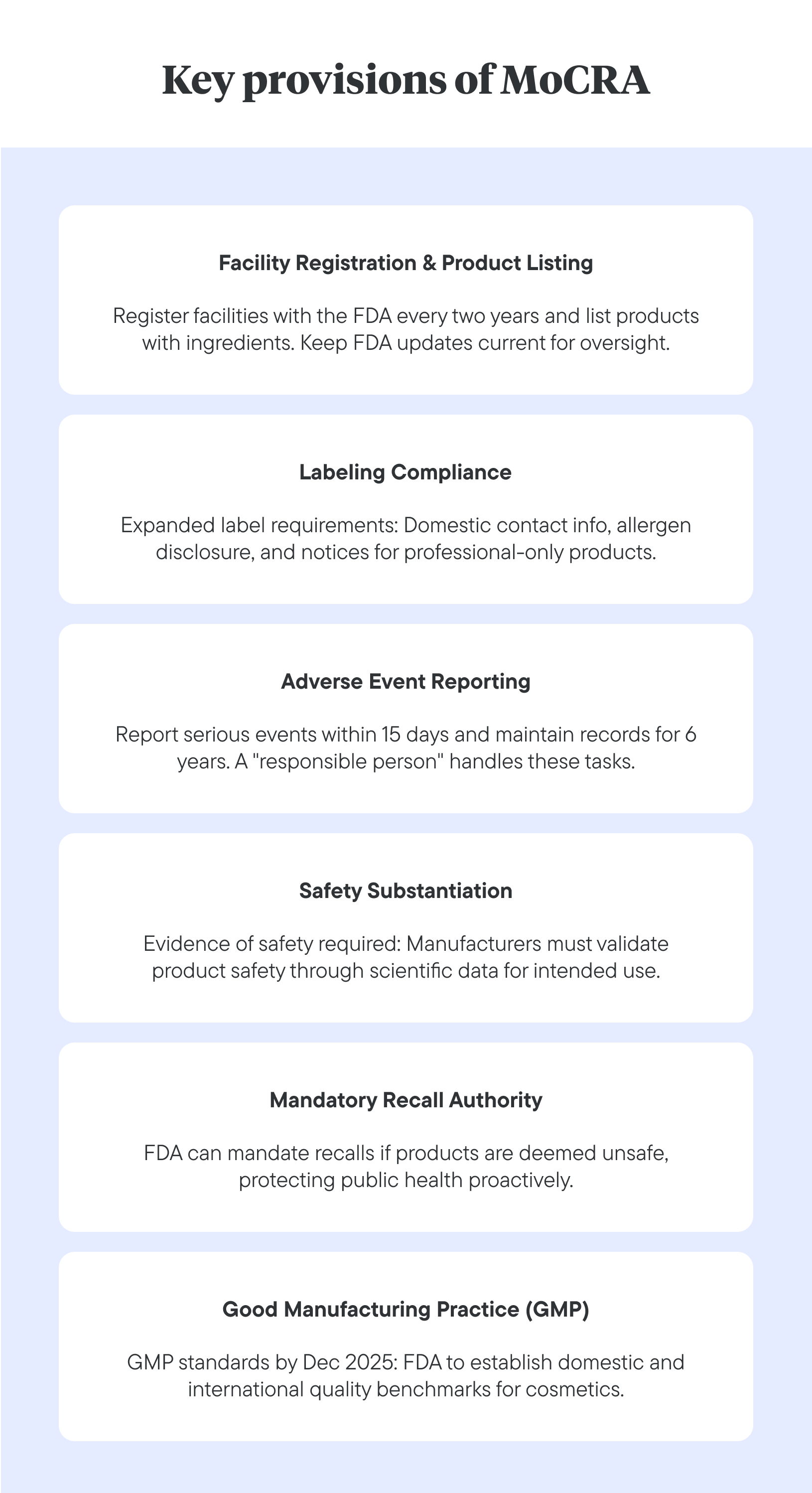 From ensuring the safety of your product to carrying transparency about ingredients on the label, here are some of the key provisions of MoCRA that you must follow.