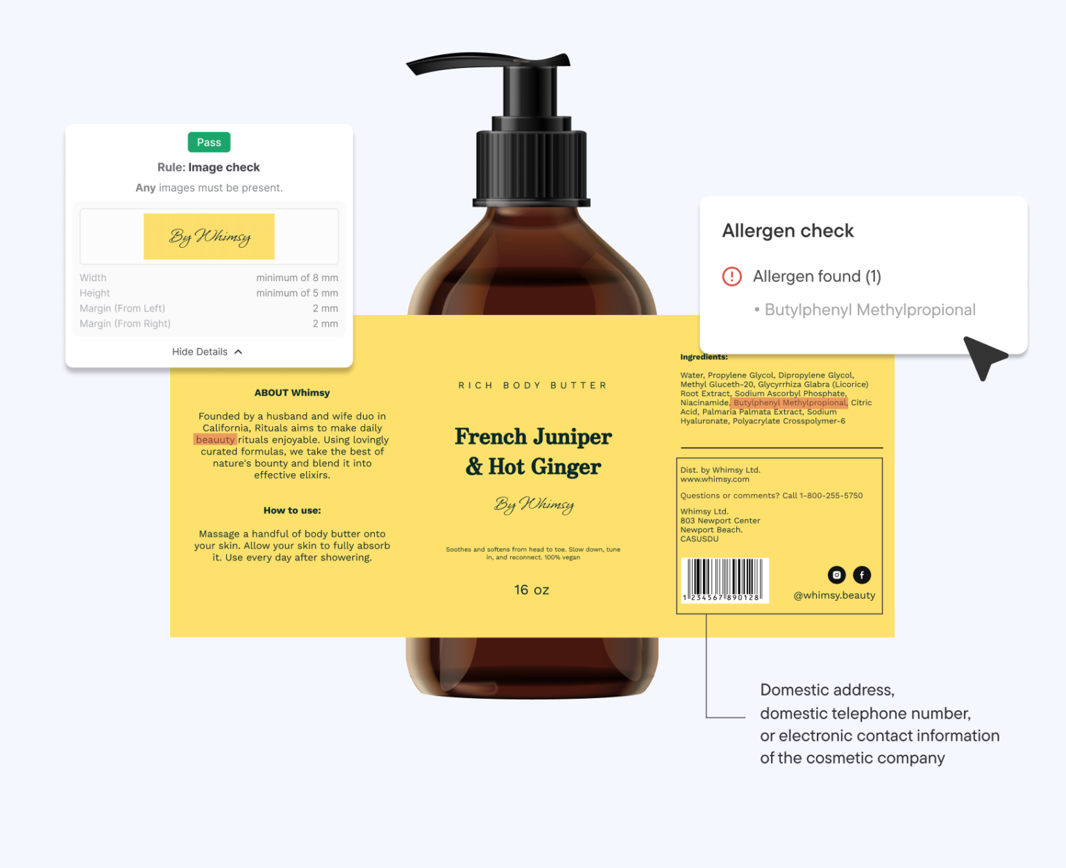 - Allergen labeling requirements: With the updated regulations regarding allergen labeling by MoCRA, Comply easily flags if your cosmetic product label is missing any allergens.