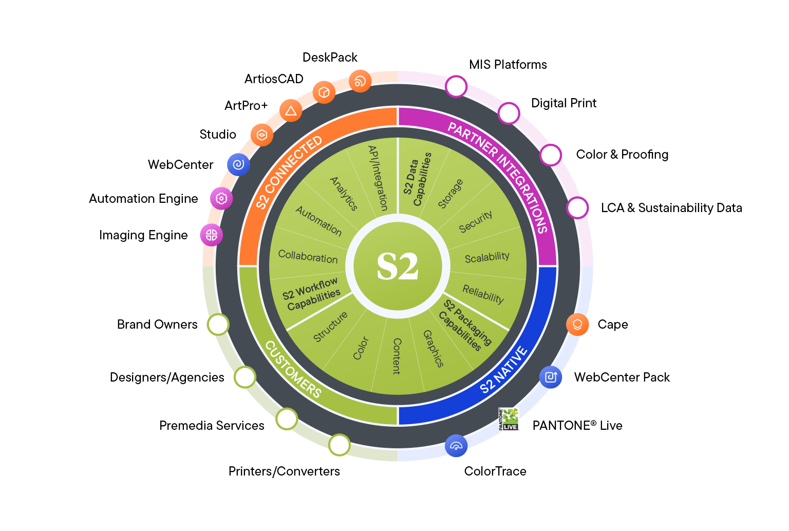 S2 is a unified platform for the packaging industry, offering seamless integration across tools with strong security, real-time collaboration, and scalable cloud infrastructure. S2 enhances efficiency, teamwork, and data integrity, while partner integrations with MIS systems, digital printing, and sustainability tools ensure smooth data flow. Supporting brand owners, agencies, premedia services, and converters, the S2 connection delivers the flexibility and collaboration needed to drive innovation and stay competitive.