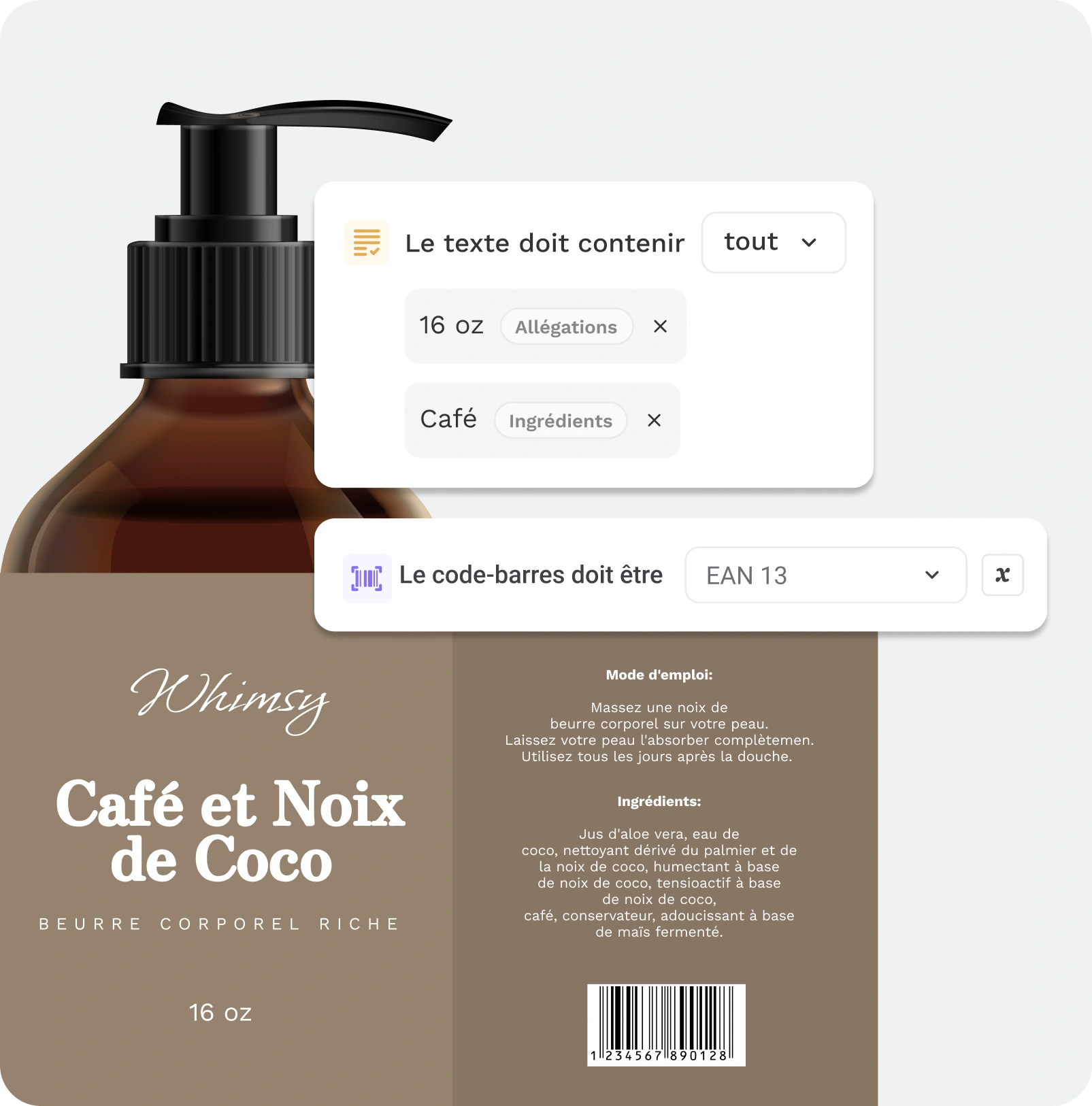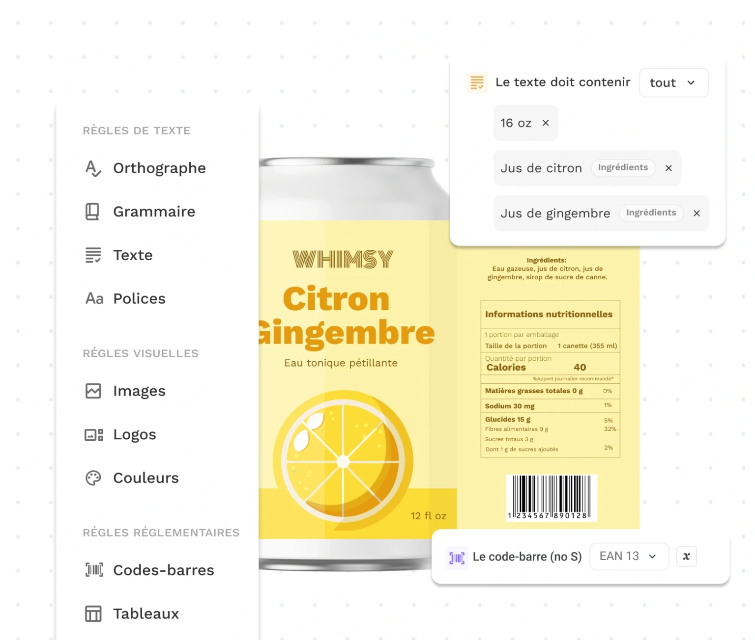 - Créez des règles pour le texte, la mise en forme, l’orthographe, les logos/symboles et les codes-barres 1D/2D.