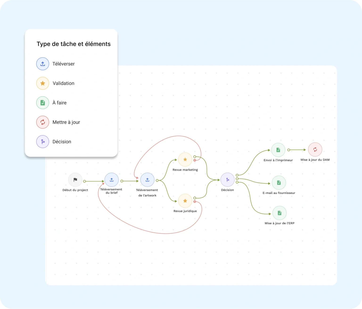 - Utilisez des chemins conditionnels pour acheminer les tâches, passer des étapes ou exécutez des tâches en parallèle, selon la complexité de votre projet.
