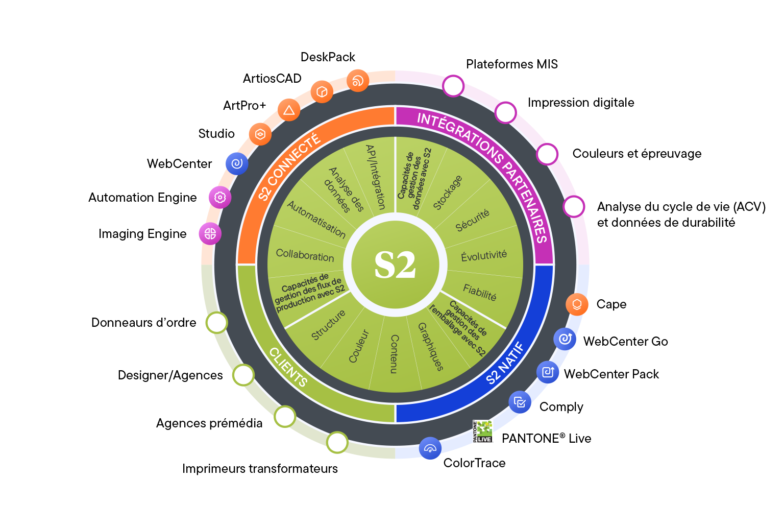 S2 est une plateforme unique qui offre une intégration transparente entre les outils, une sécurité renforcée, une collaboration en temps réel et une infrastructure cloud évolutive pour l’industrie de l’emballage. S2 améliore l’efficacité, le travail d’équipe et l’intégrité des données, tandis que les intégrations des partenaires avec les systèmes MIS, l’impression numérique et les outils de développement durable garantissent un flux de données fluide. Pour les propriétaires de marques, les agences de design et prémédia ainsi que les transformateurs, la connexion S2 offre la flexibilité et la collaboration nécessaires pour stimuler l’innovation et rester compétitif.