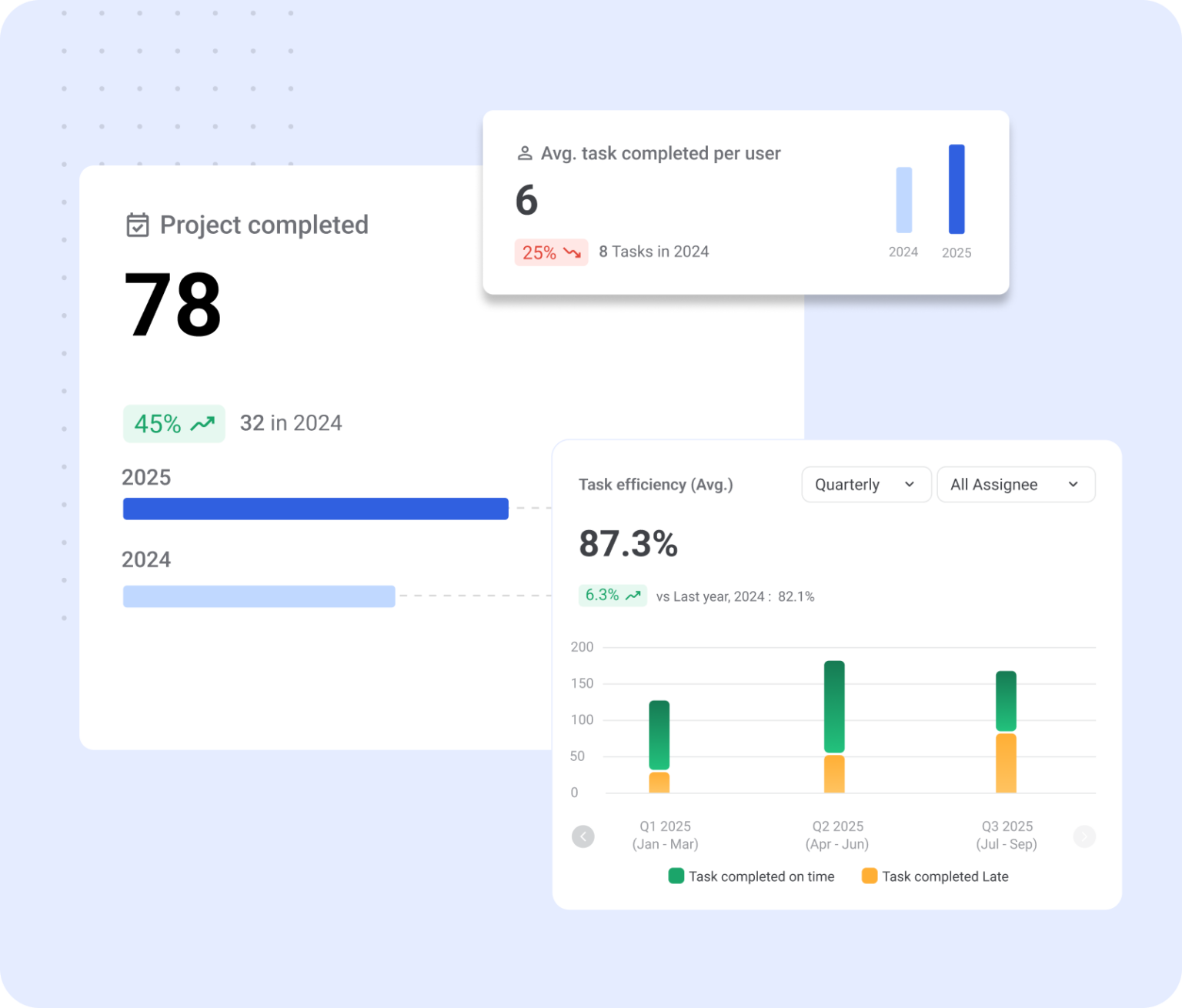 Analytics helps you spot recurring issues in every delayed project, rework, and approval bottleneck, so you can fix them before they happen again.