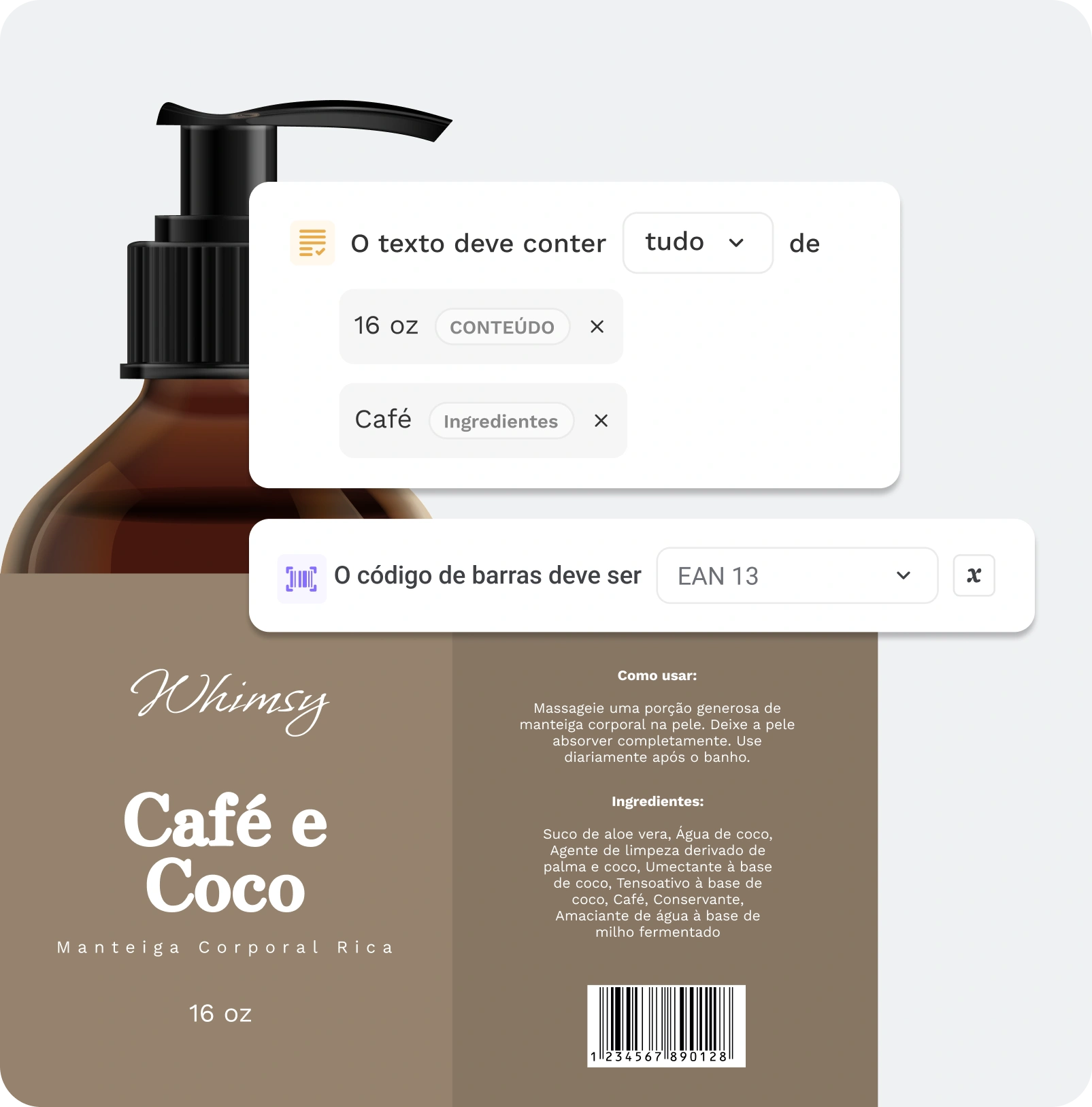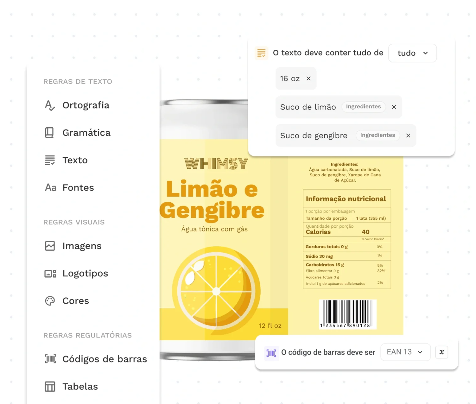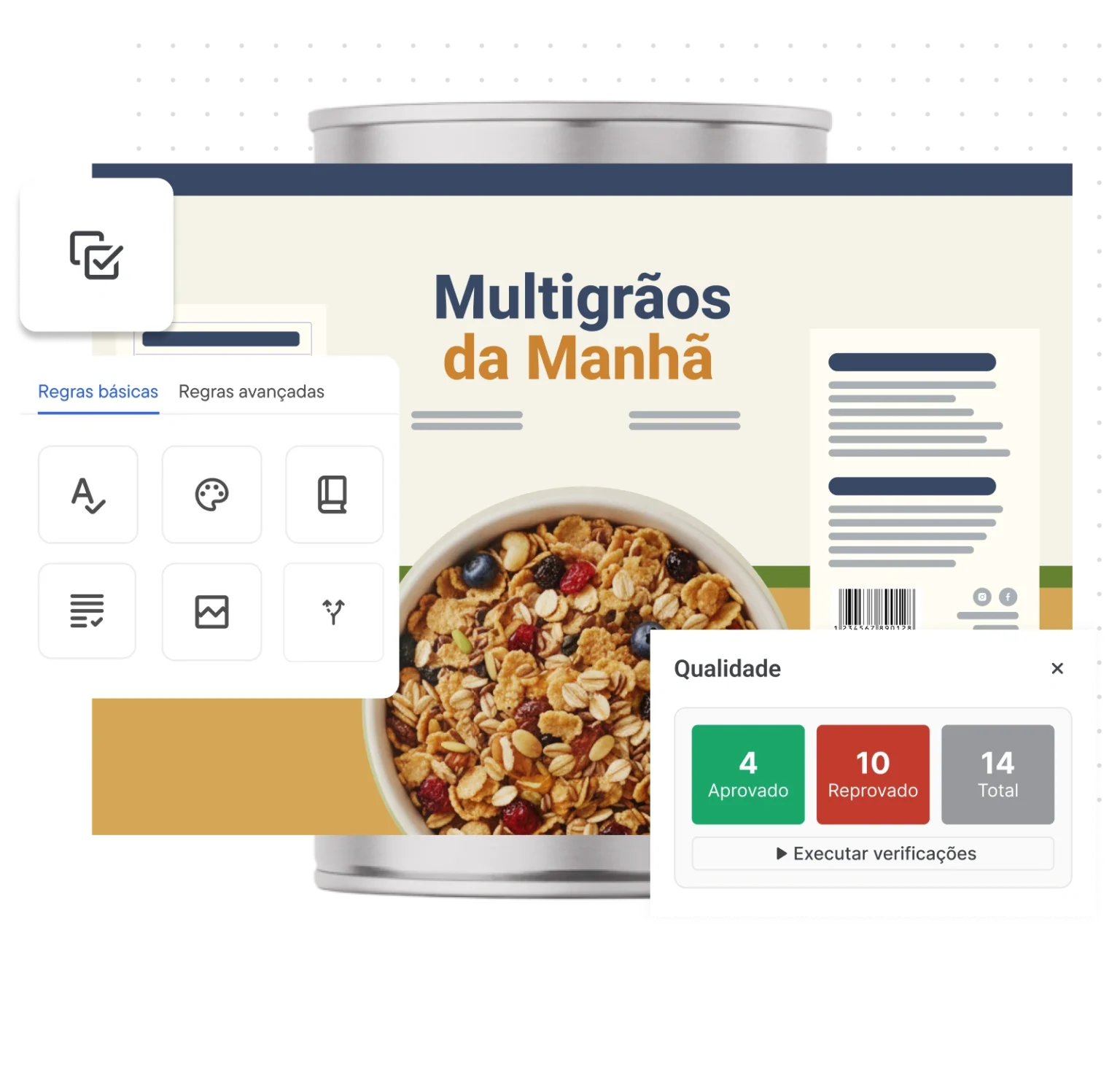 - Crie regras para texto, formatação, ortografia, logotipos/símbolos e códigos de barras 1D/2D.