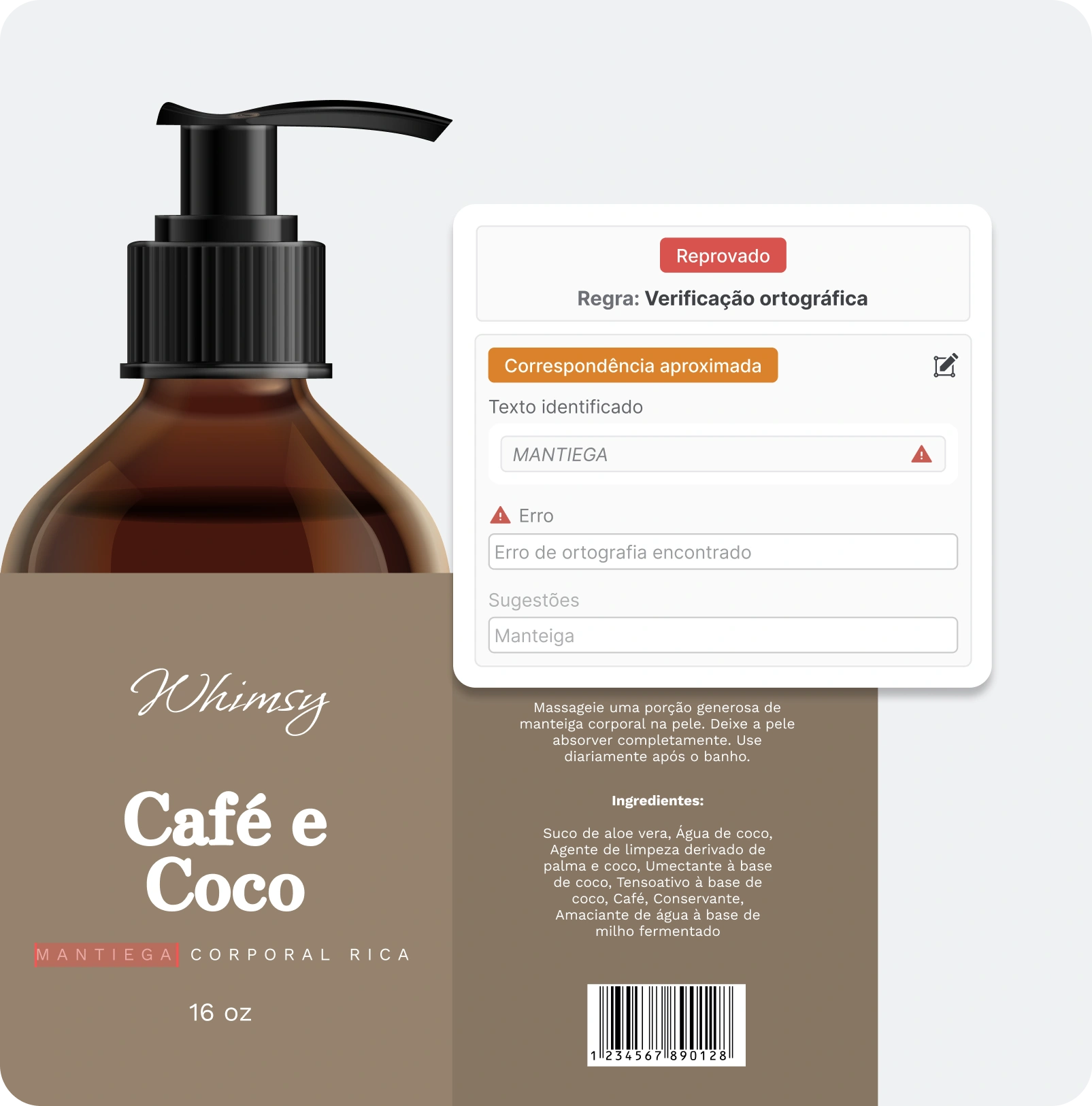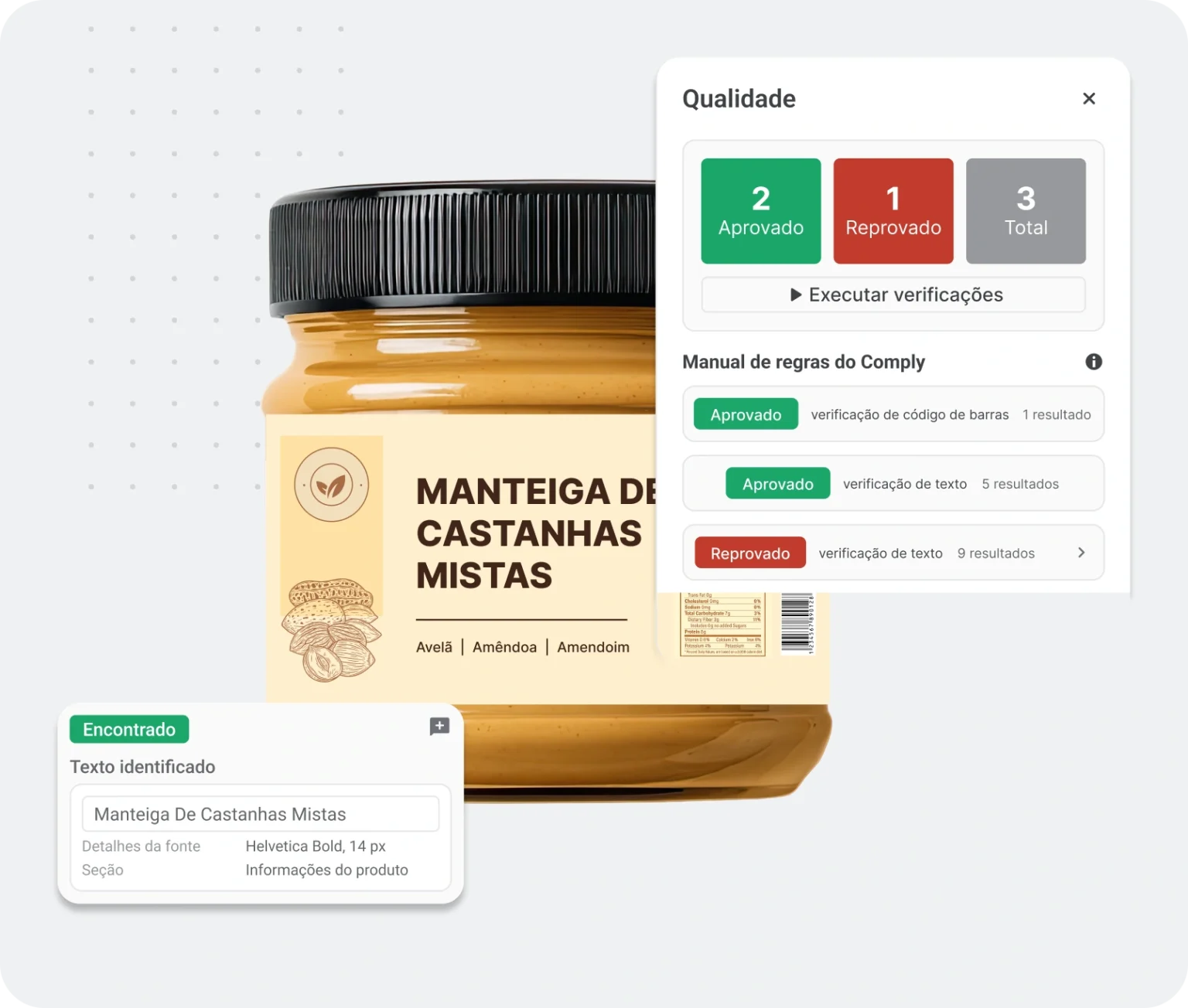 - Texto e alegações: comparação com conteúdo aprovado (incluindo alérgenos).